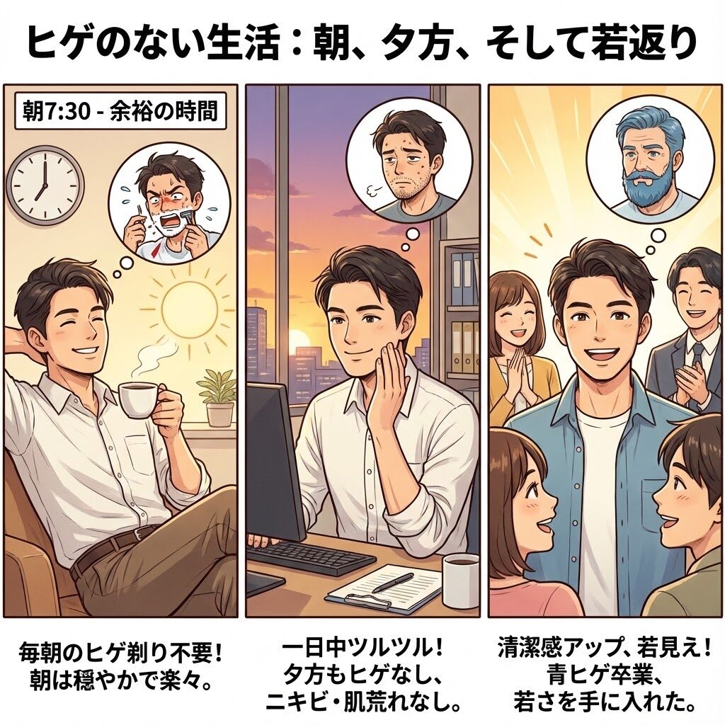 ・毎朝ヒゲ剃りが必要なくなったので、朝の時間に余裕ができた
